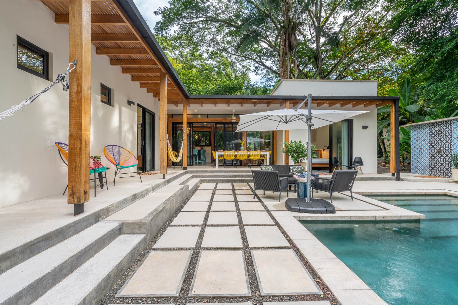 This home was designed to integrate a wide jungle view with an indoor/outdoor vibe. The house surrounds an outdoor saltwater pool where you can float and watch the monkeys playing up in the trees!